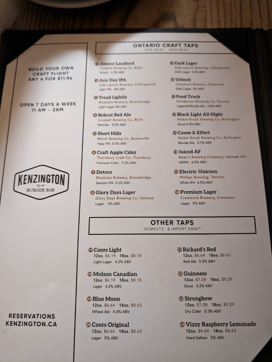 Introducing the menu at Kenzington Burger Bar, located at 40 Dunlop St E, Barrie, ON, offers a delightful mix of flavors that satisfy every craving. Their handhelds feature options like the Kenzie Club, a grilled chicken sandwich, and the fiery Spicy Chicken Sandwich paired with jalapeños and buttermilk ranch. For a vegetarian option, the Veggie Wrap is loaded with marinated veggies and goat cheese.